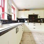 With twin rear vertical sliding double glazed sash windows. The kitchen enjoys an extensive range of shaker style furniture finished in an Old English White with a complementary patterned rolled edge working top surface with tiled splash back that incorporates a double bowl sink unit with drainer to the side and block mixer tap, built-in six ring stainless steel gas hob with overhead extractor and eye level double oven, tiled flooring, inset ceiling spotlights and doors through to;