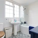 Side uPVC double glazed window with isnet patterned glazing, enjoying a modern suite in white comprising a low flush WC, pedestal wash hand basin, overhead mains shower, mosaic tiled flooring, majority tiling to walls fitted towel rail and inset ceiling spotlights.