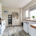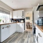 Rear uPVC double glazed barn style door leads to the garden with adjoining windows. The kitchen enjoys an extensive range of white fronted modern furniture with a complementary butcher block style rolled edge worktop with tiled splash back incorporating a one and a half bowl sink unit with drainer to the side and block mixer tap, built-in four ring electric hob with oven beneath and overhead canopied extractor fan, laminate flooring, inset ceiling spotlights and modern towel rail.