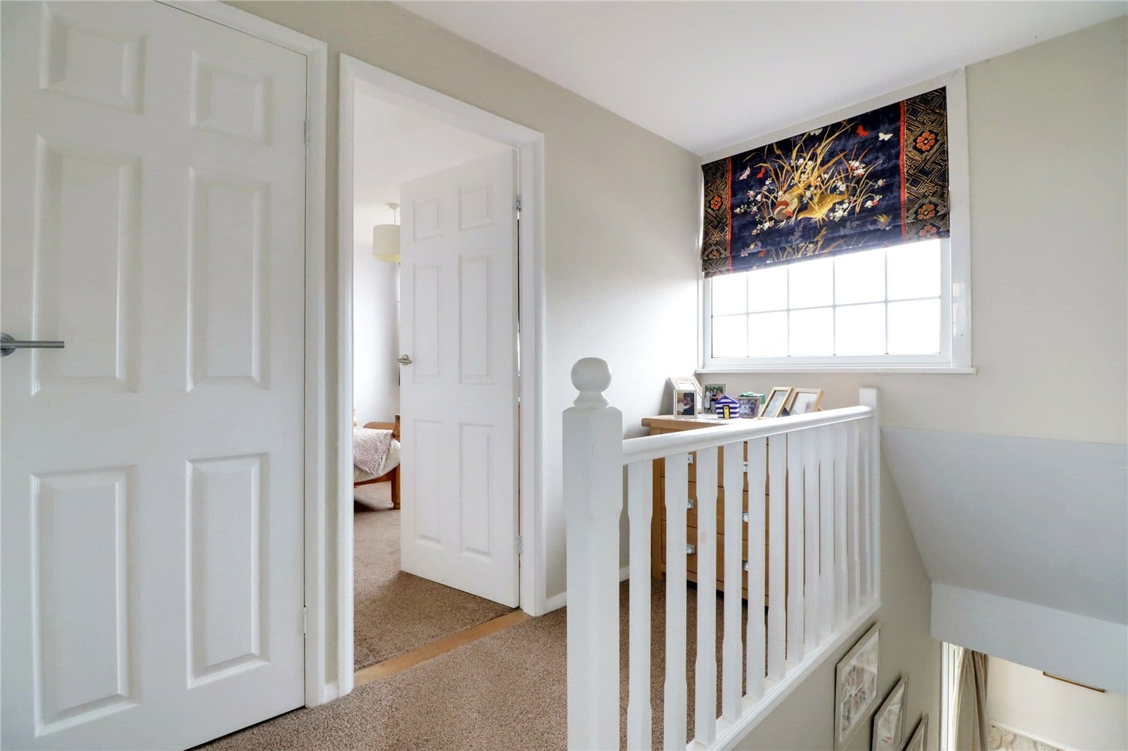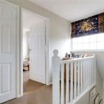 Front uPVC double glazed window, continuation of open spell balustrading, loft access and built-in storage cupboard.