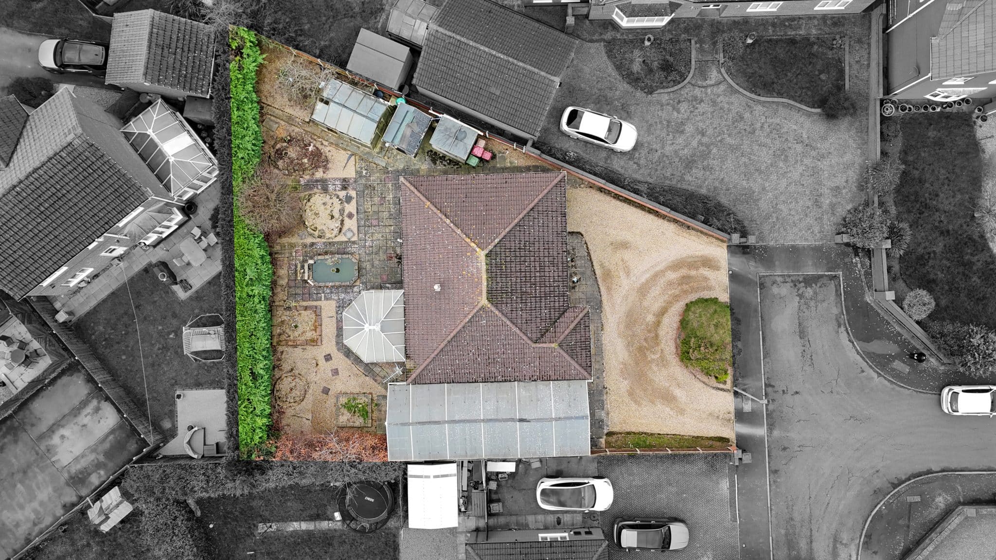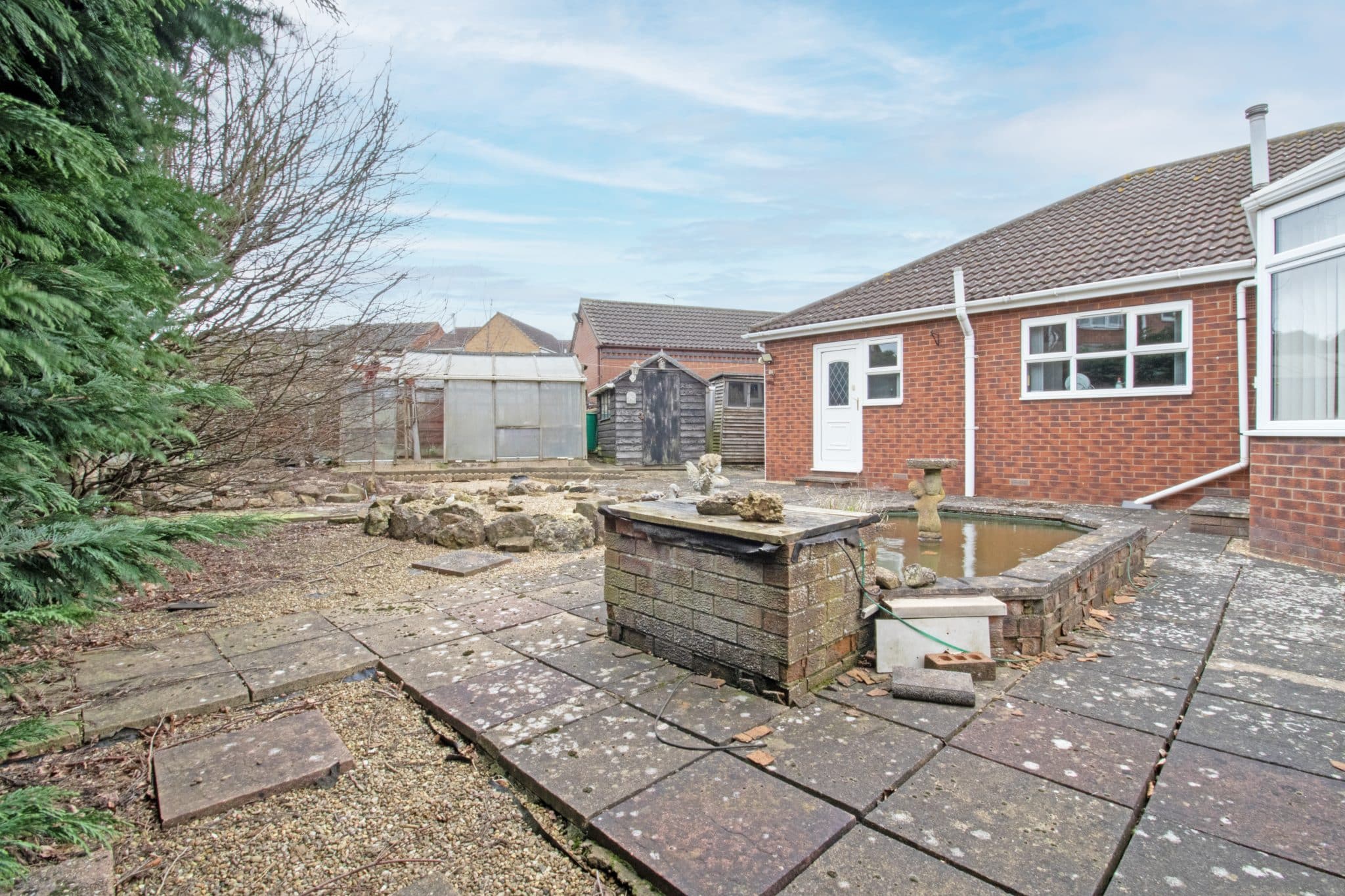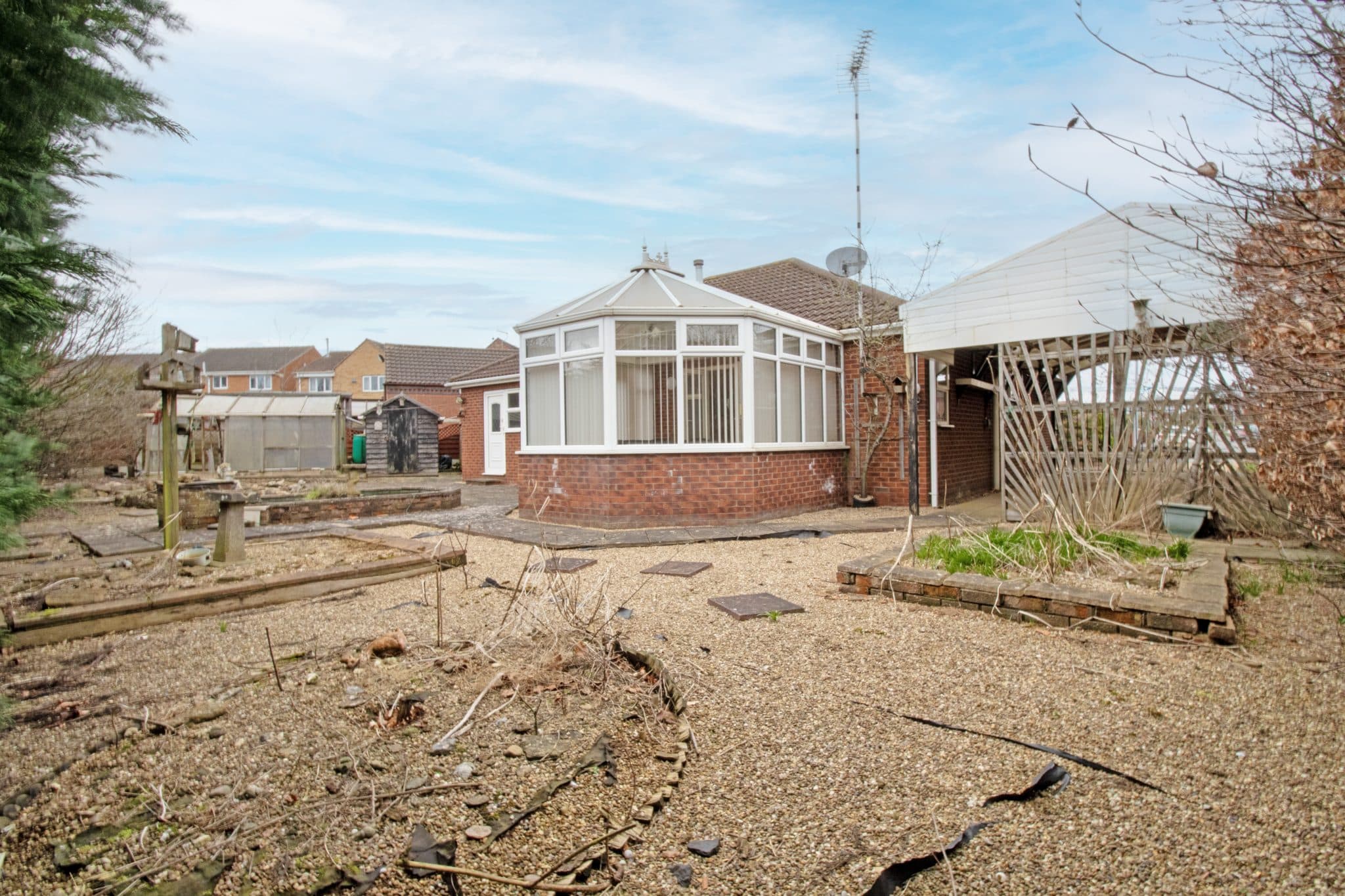 To the rear, the enclosed and relatively private garden is a fantastic size and has been thoughtfully designed with ease of maintenance in mind. Mainly pebbled and paved, it provides a pleasant outdoor space to enjoy while requiring minimal upkeep. The garden also features several useful outbuildings, including two storage sheds and a greenhouse.
